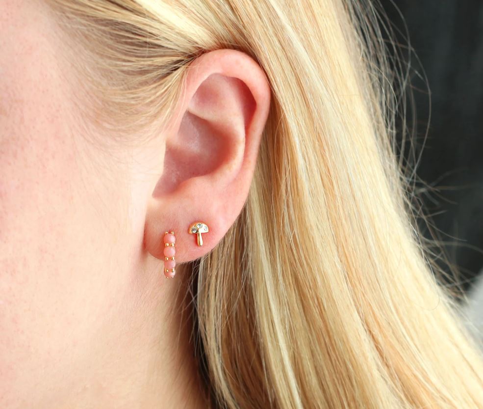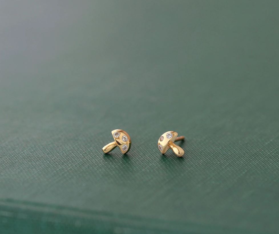 Add some mushroom magic to your life with our Mushroom Stud Earrings! These adorable studs stand approximately 6.5mm tall, are adorned with dazzling cubic zirconia crystals. Packaged in our signature glass bottle