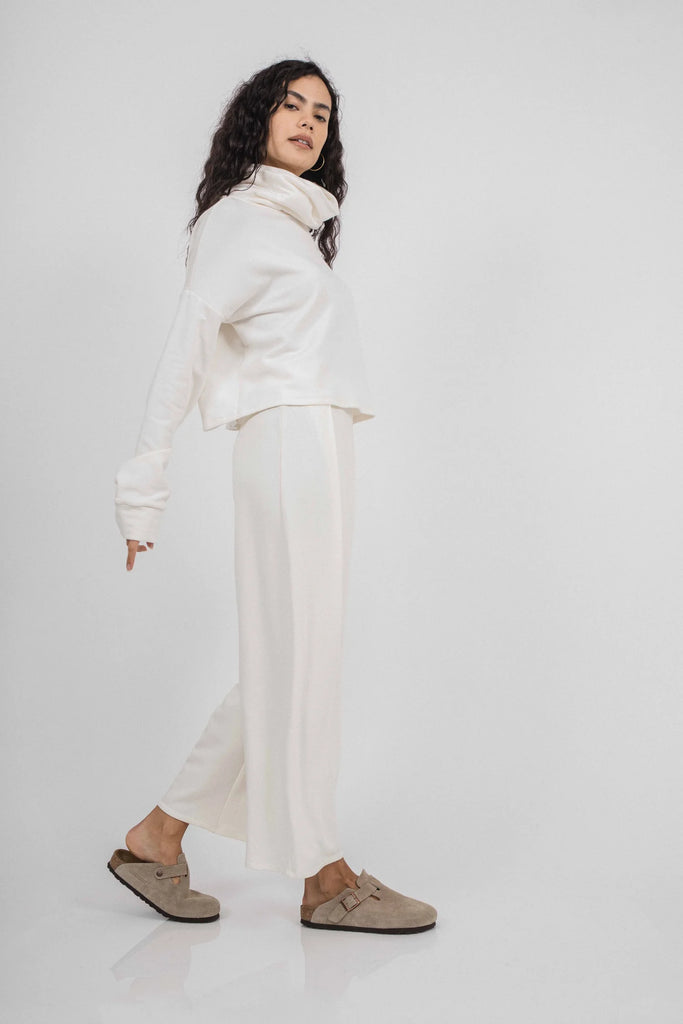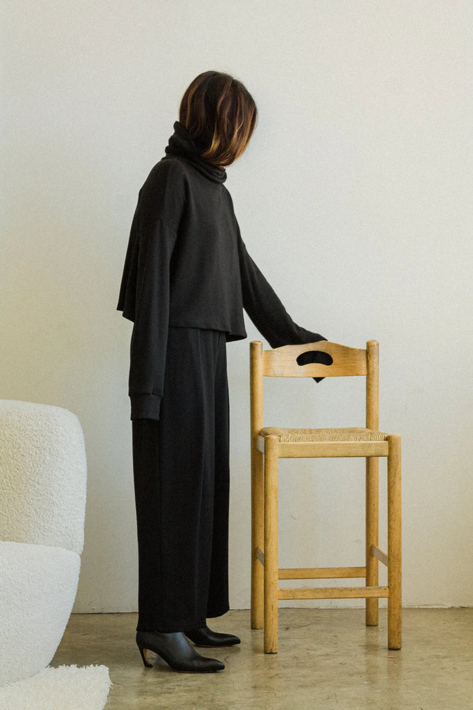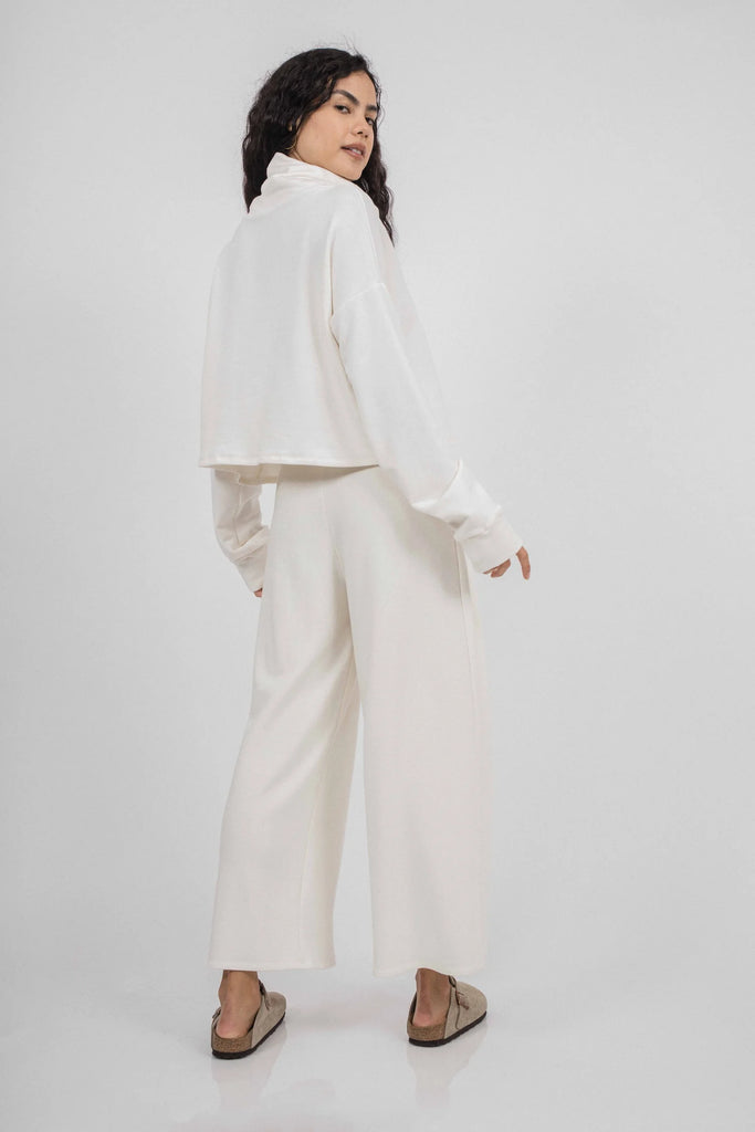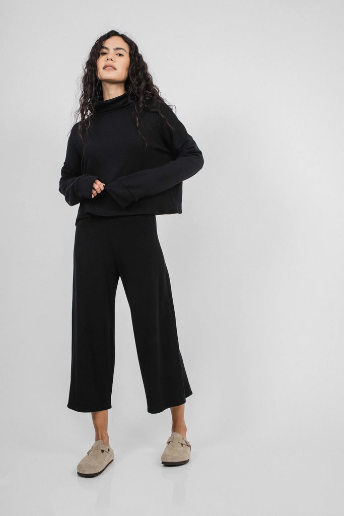 The Nina Crop Sweater is a cropped silhouette. The top has a loose turtleneck detail with a drop shoulder. Fit is true to size.