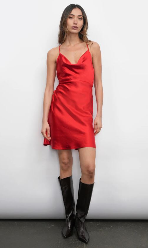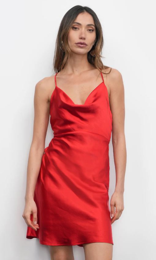 This dress is crafted from a smooth, luxurious satin-like fabric in a vibrant red hue. It features an elegant cowl neckline and a flattering mini length. The design is highlighted by delicate cross straps at the back, which add a unique and sophisticated detail. The dress has a relaxed yet body-skimming silhouette that drapes beautifully, making it both comfortable and stylish.
