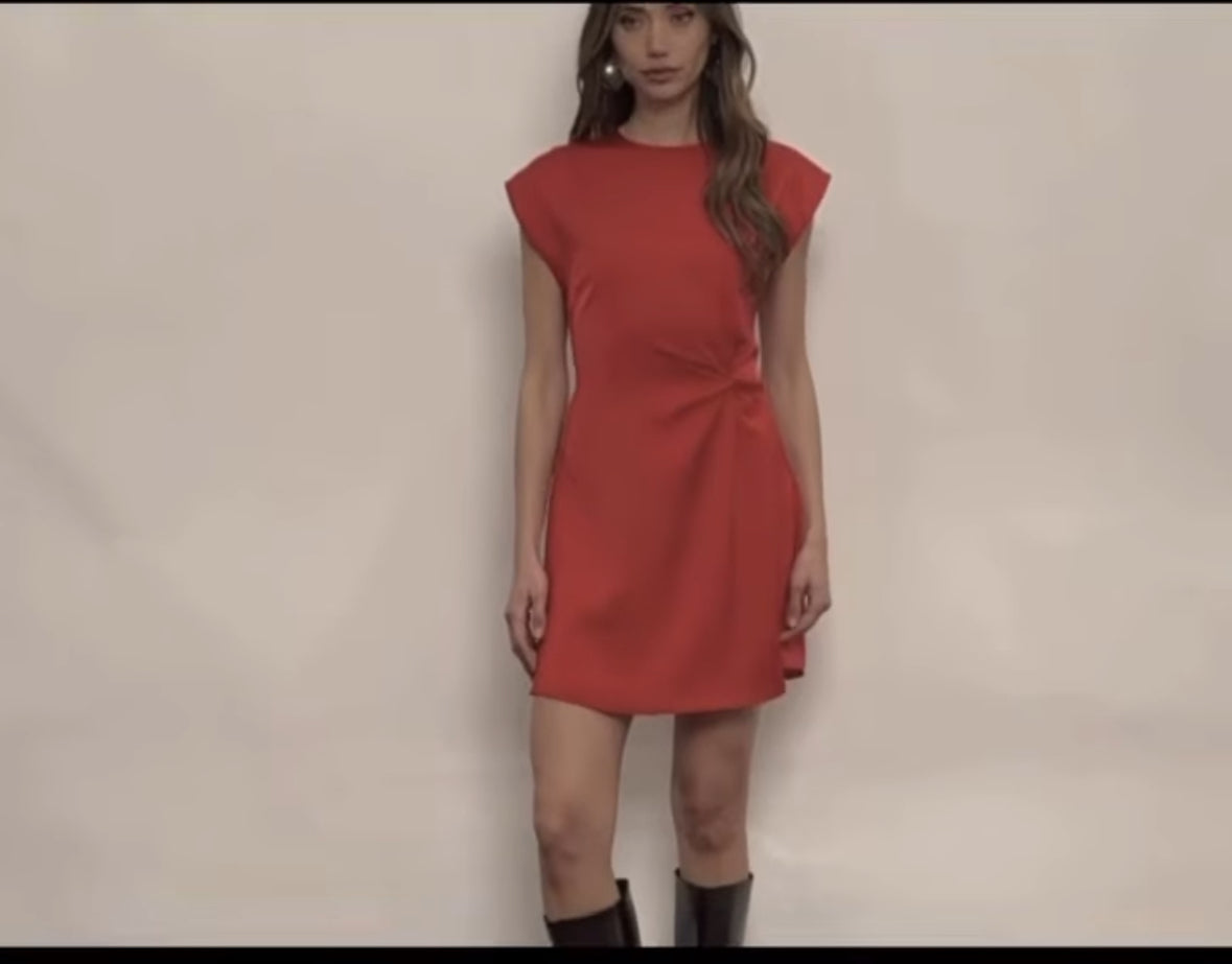 This dress is crafted from a smooth, high-shine satin-like fabric in a vibrant red color. It features a draped silhouette with dolman sleeves, a deep V-neckline, and a stylish side twist detail that creates a flattering shape at the waist