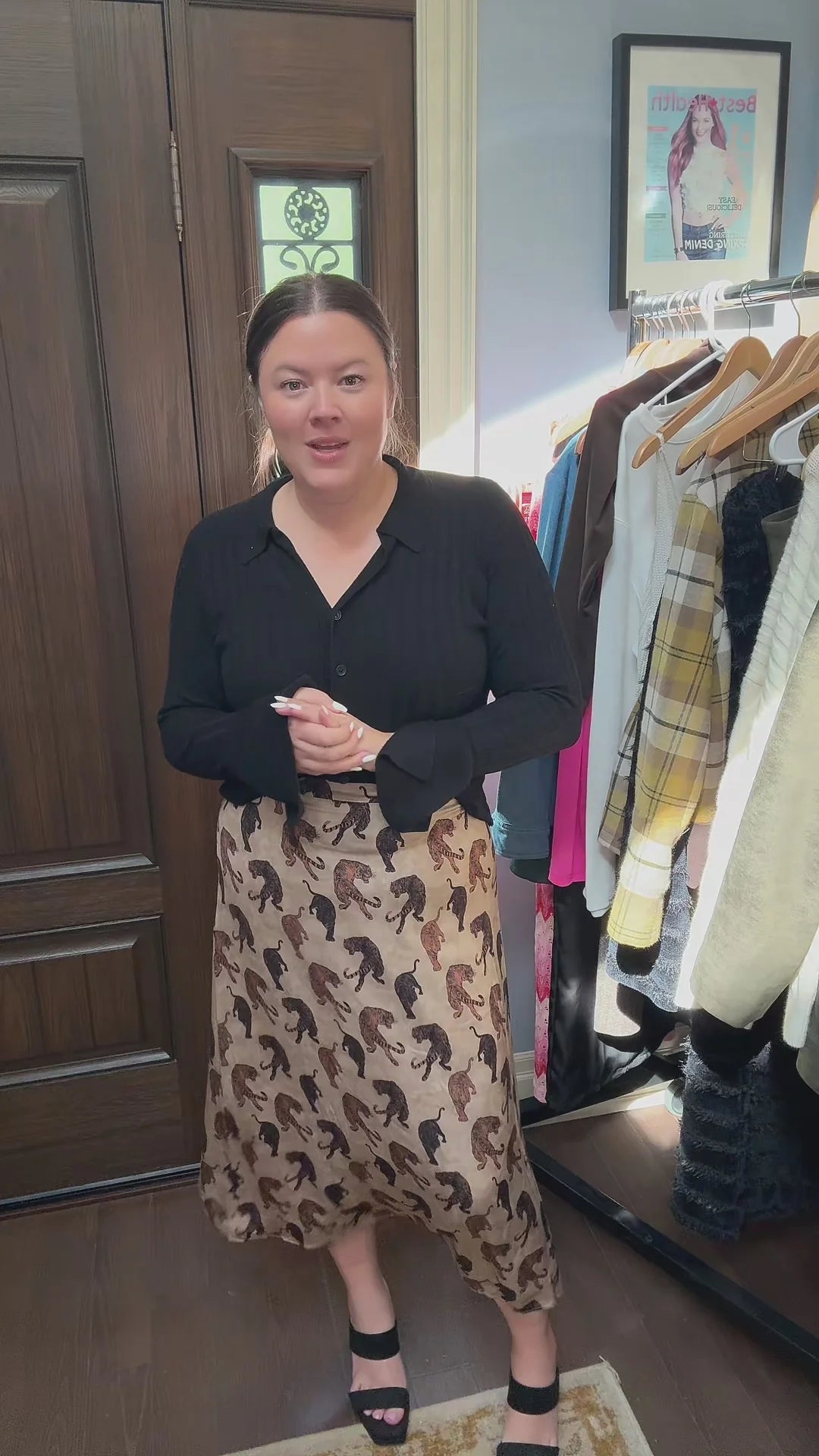 This tiger print midi skirt features a refined neutral palette on smooth, non-stretch satin fabric, offering a sophisticated take on animal print. Its A-line silhouette flatters a variety of body shapes, while the tea-length cut provides elegant coverage. A discreet back zipper ensures a clean finish and easy wear. Crafted in Canada, this skirt combines quality construction with timeless style, making it a versatile addition to your wardrobe