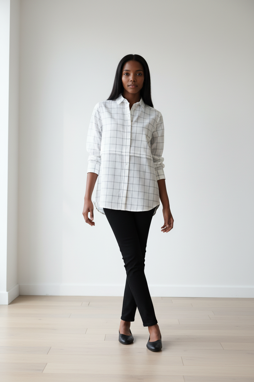 This windowpane white and blue print top has a fun quirky twist! Remove the buttons along the center to turn it into a crop top!