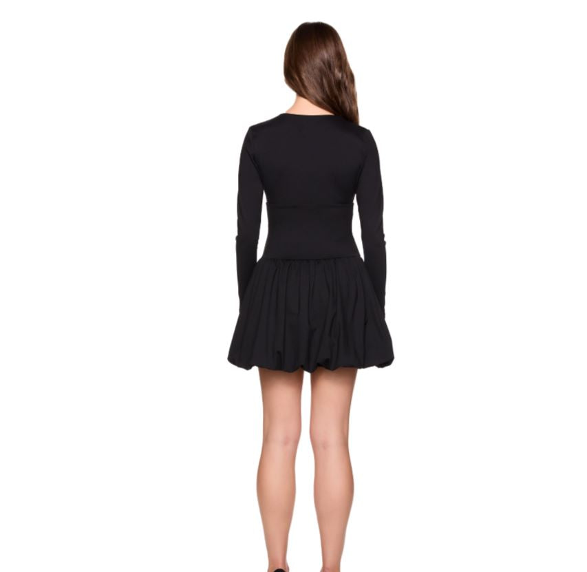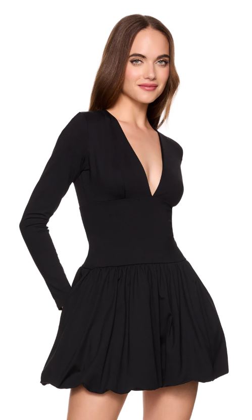 This bubble bottom dress is a sleek way to take on this trend. A classic fitted top with long sleeves helps balance out the full bubble hem-lie skirt. This is a perfect party dress for all your upcoming events.
