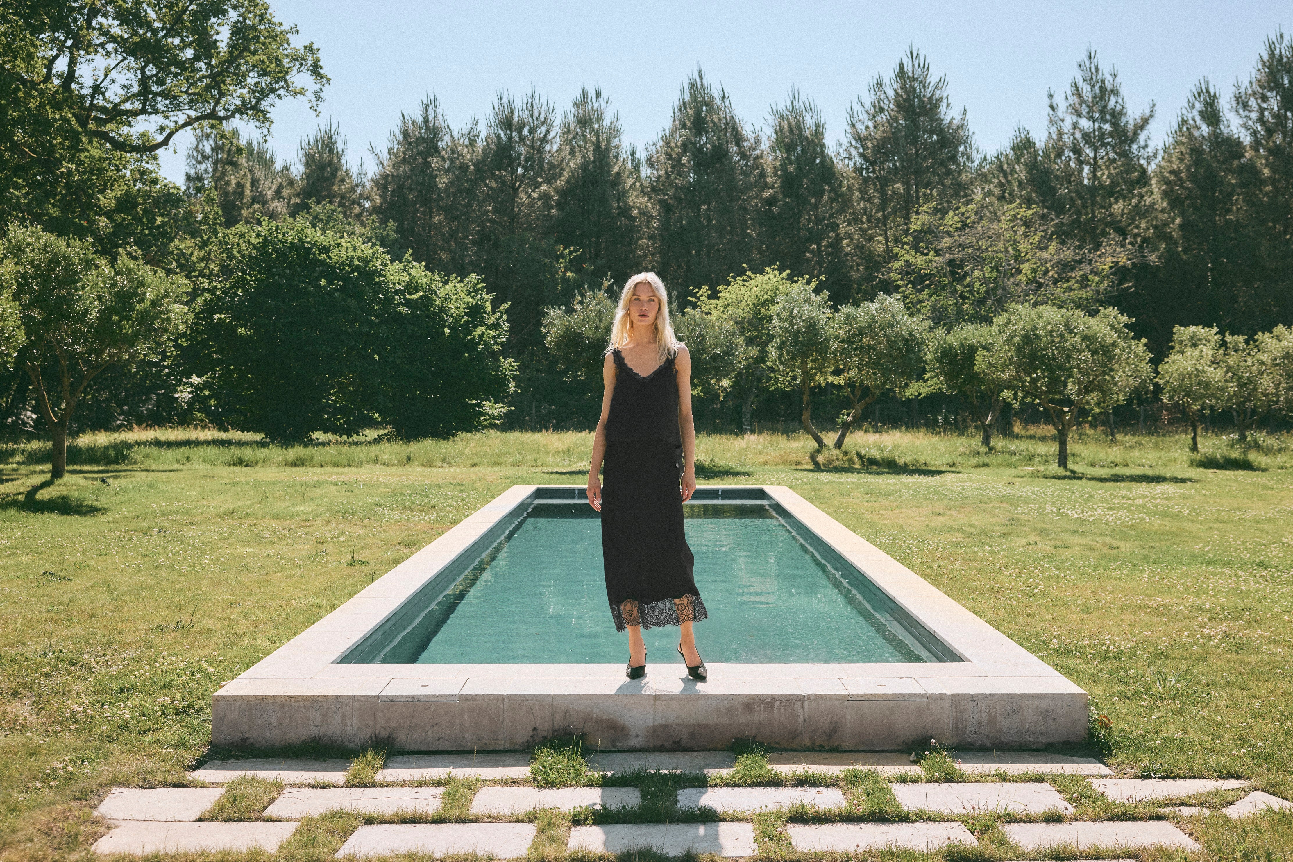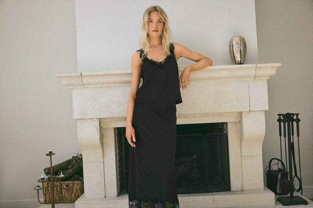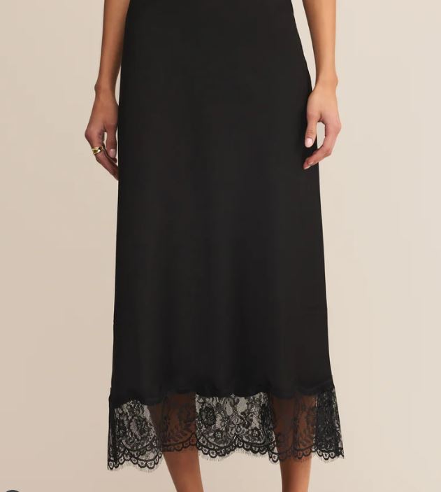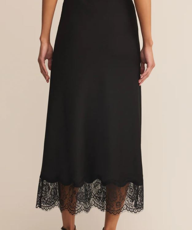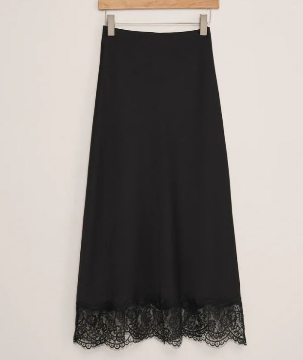 Crafted from smooth, lustrous satin, this high-rise midi skirt brings an elevated touch with a scalloped lace hem. The pull-on silhouette offers comfort and polish in equal measure, perfect for holiday dinners, cocktail hours, and everything in between.
