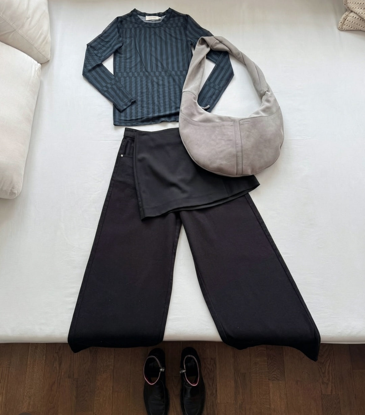 This fitted mesh long sleeve is a gorgeous deep blue/black combo stripe. Depending on your comfort level; rock this with a black bralette (or lace for extra va va voom) or a simple tank underneath.