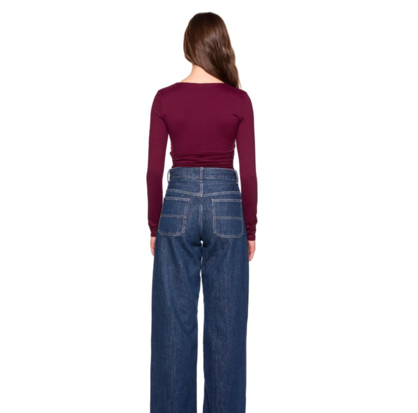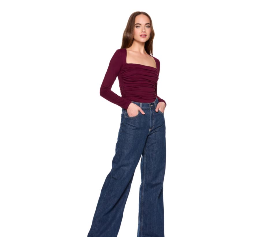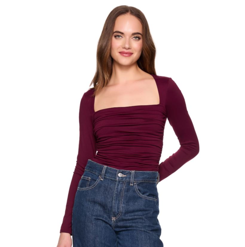 This beautiful port colored long sleeve top is a trending color and incredibly flattering silhouette. Tuck her into jeans and you're right for a night on the town!