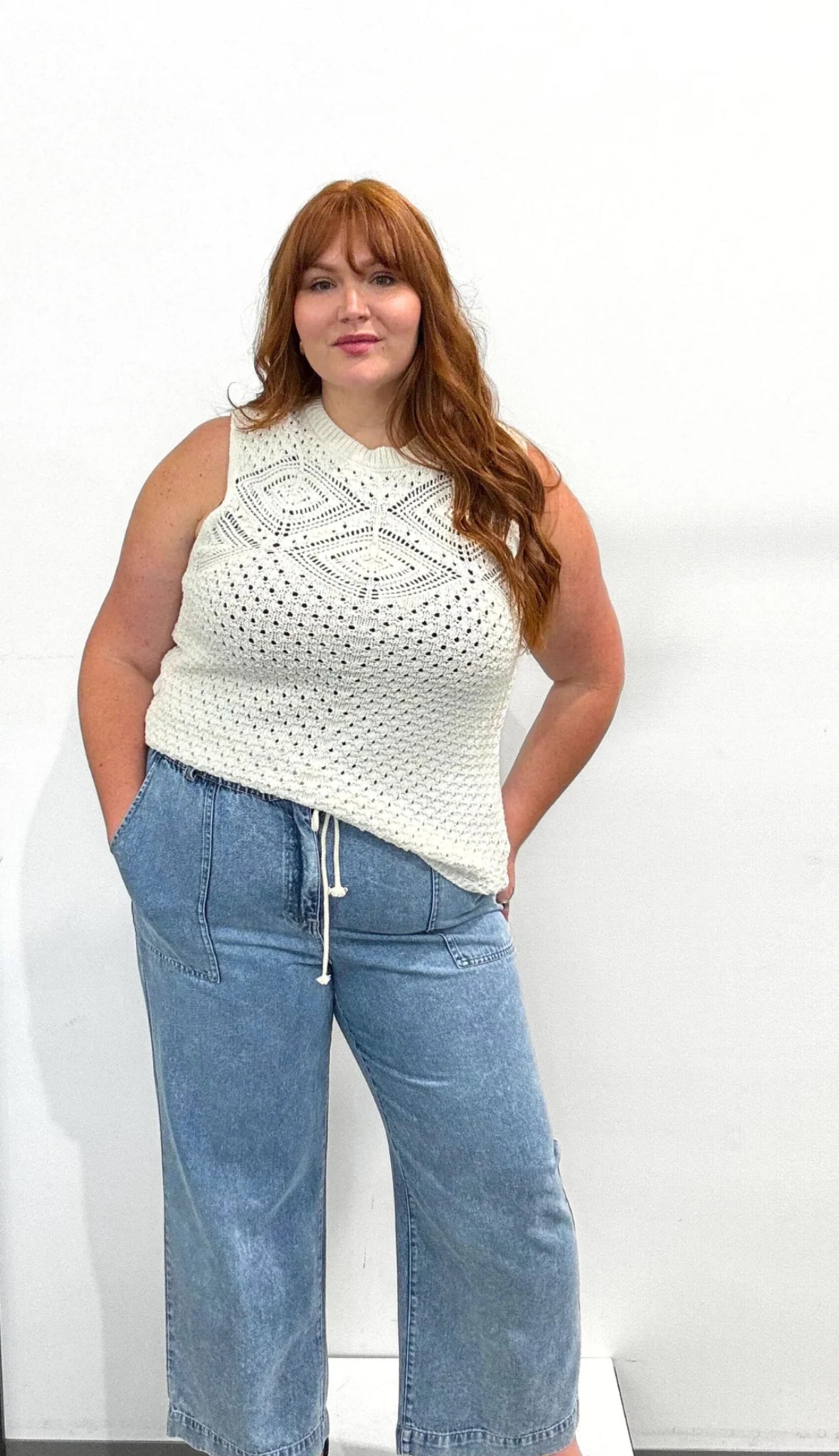 This gorgeous tank is a thin sweater material with cut out design details. Wear it alone or layer it as the weather cools. This is a staff favorite for sure!
