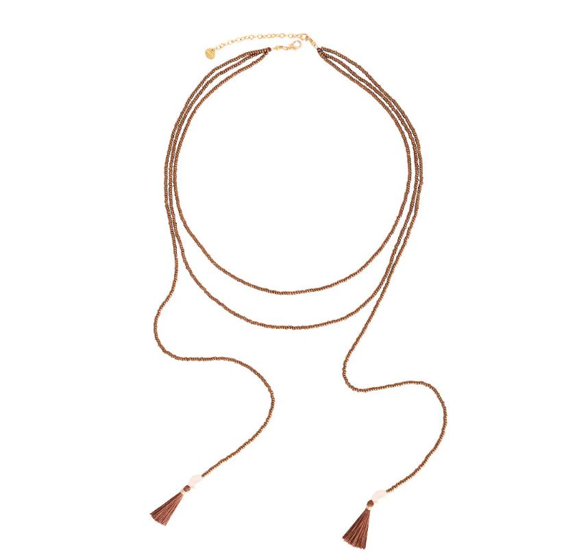 A refined mix of Miyuki beads, delicate bronze gold-plated chains. This necklace brings a quiet strength to both day and evening looks.