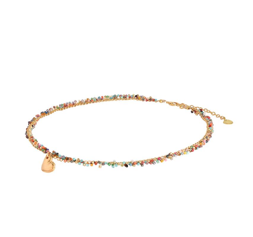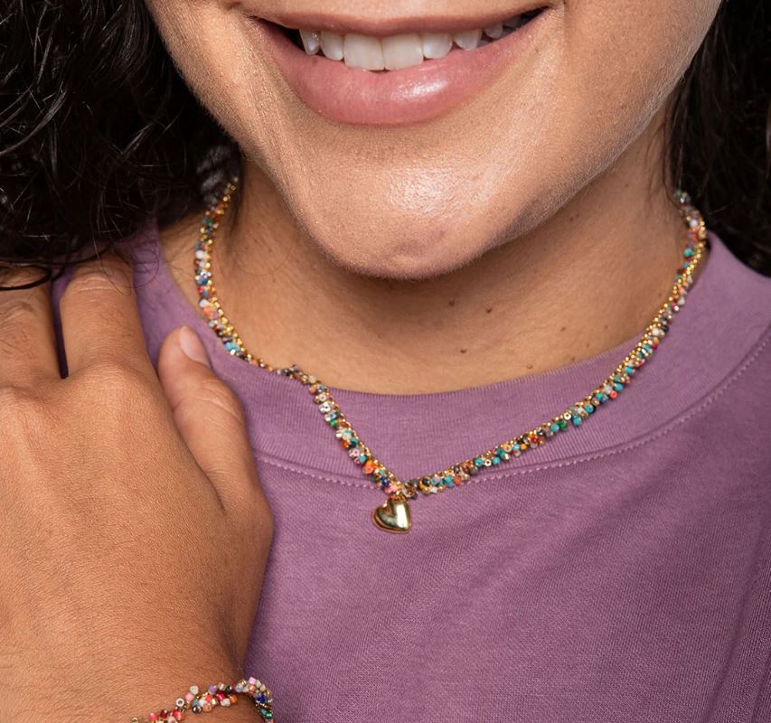 With a golden heart charm and multicolor beads, this necklace radiates charm and warmth. An everyday piece with a meaningful twist.