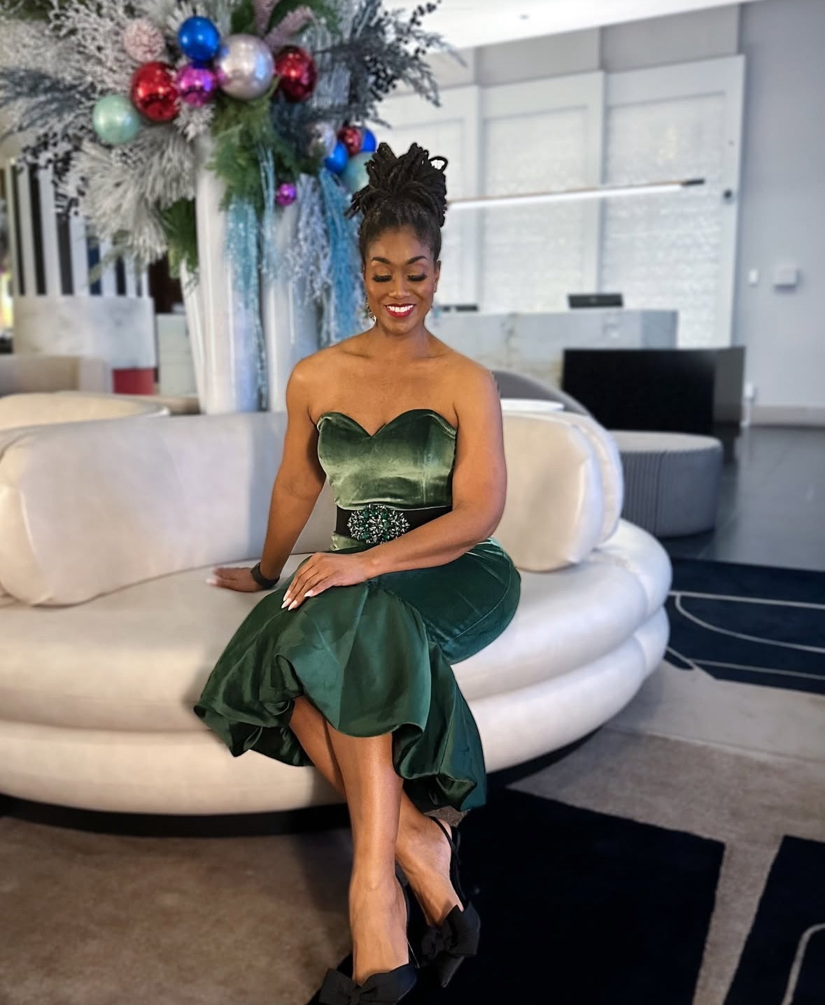This absolutely stunning emerald green dress will turn heads this holiday season. A bubble hem and sweetheart neckline make this classic style truly stunning. AND it’s a velvet fabric combo. A dream.