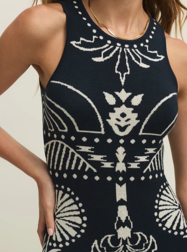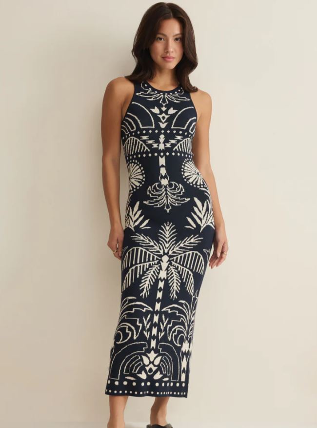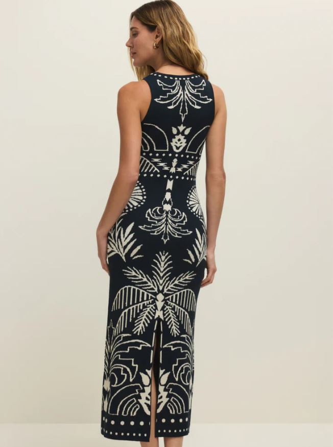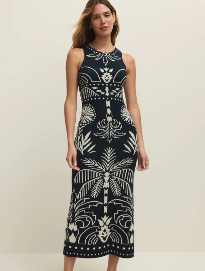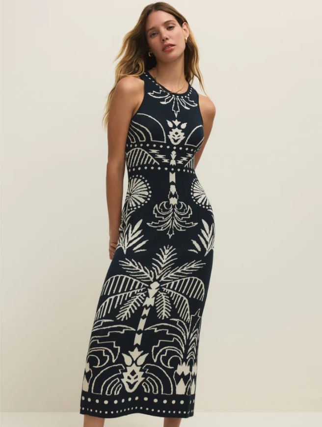 Soft sweater knit meets a sleeveless midi silhouette with a palm print that feels like a vacation. Finished with a back slit and midweight feel, it’s made for breezy nights and easy travels
