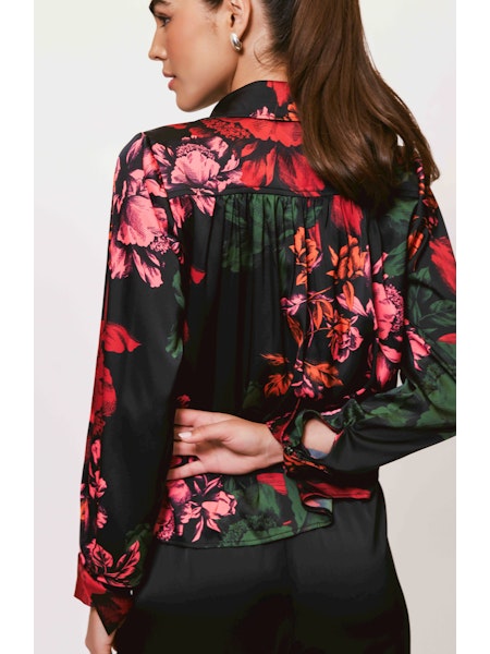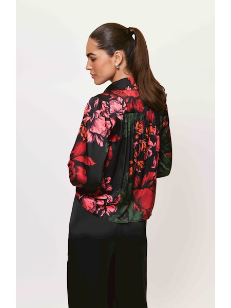 This beautiful dark floral sketch blouse falls wonderfully with perfect pleating on the back and a button down front
