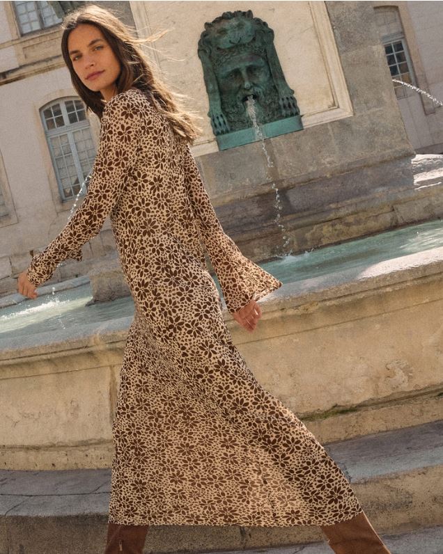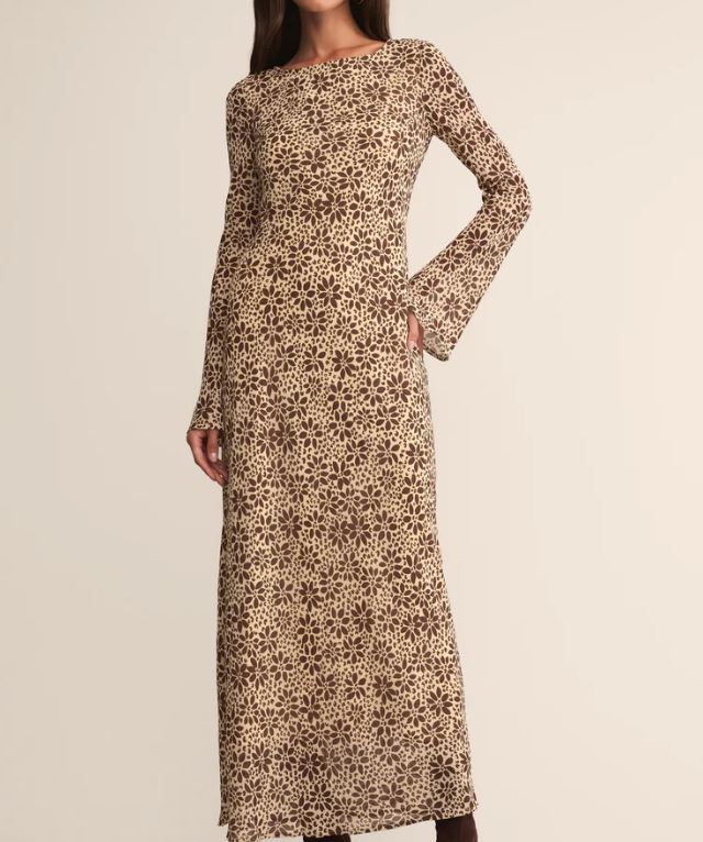 Lightly textured crepe and a soft floral print bring a romantic feel to this maxi dress. The boat neckline and long sleeves create a refined silhouette you’ll reach for season after season.