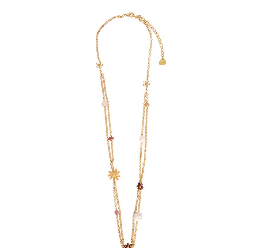 A joyful burst; gold-plated flower charms and natural pearls and layered bronze chains. This necklace brings playful elegance to your days ahead