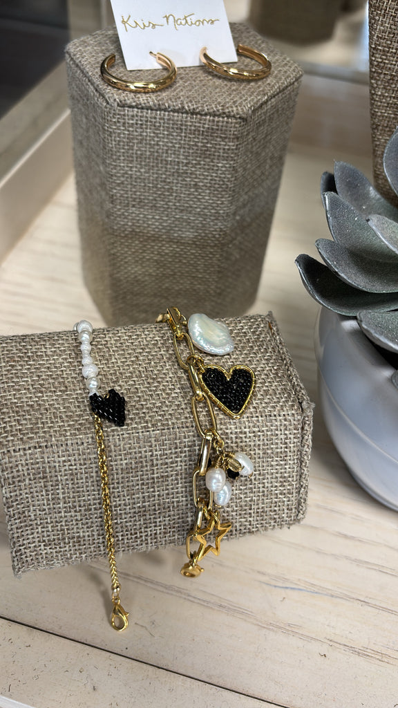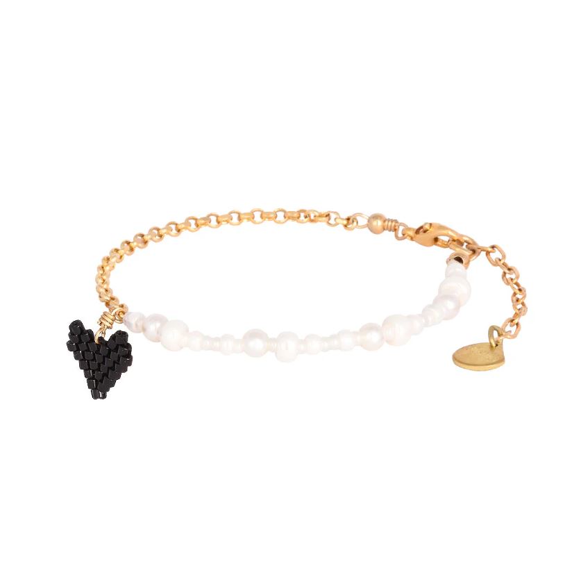 A single black heart made of Miyuki Beadsis framed by gold bronze-plated chains and a synthetic pearls. The bracelet is woven with polyester thread and closes with a bronze gold plated hook