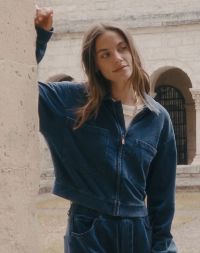 The vintage look of denim meets the softness of your favorite sweatshirt in this cropped jacket. Finished with roomy pockets and a zip front, it’s the kind of piece that works just as well with the matching pants as it does with a simple tee.