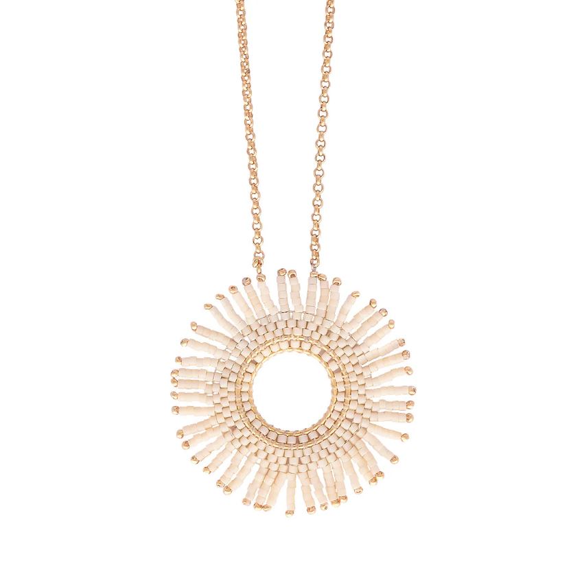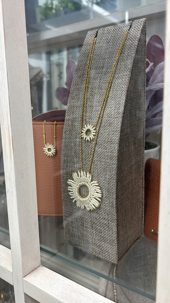 A long large fringe sun necklace in white beading. Layer it with the matching mini chain or bracelet for a beautiful set