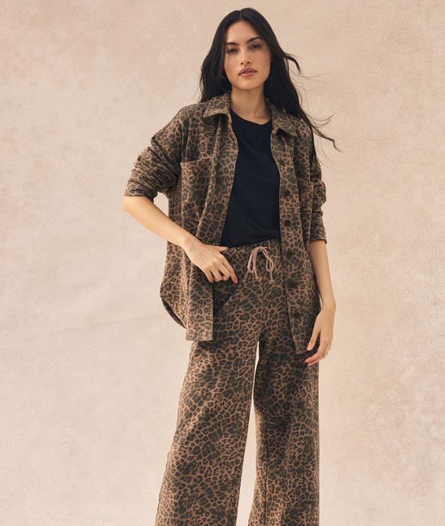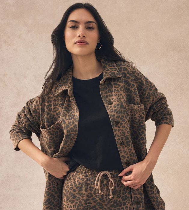 This cotton French Terry shirt jacket brings a soft, lived-in feel with a playful leopard print that stands out. Finished with a button front and patch pockets, it’s the perfect layer to throw on for a little extra edge on cooler days.