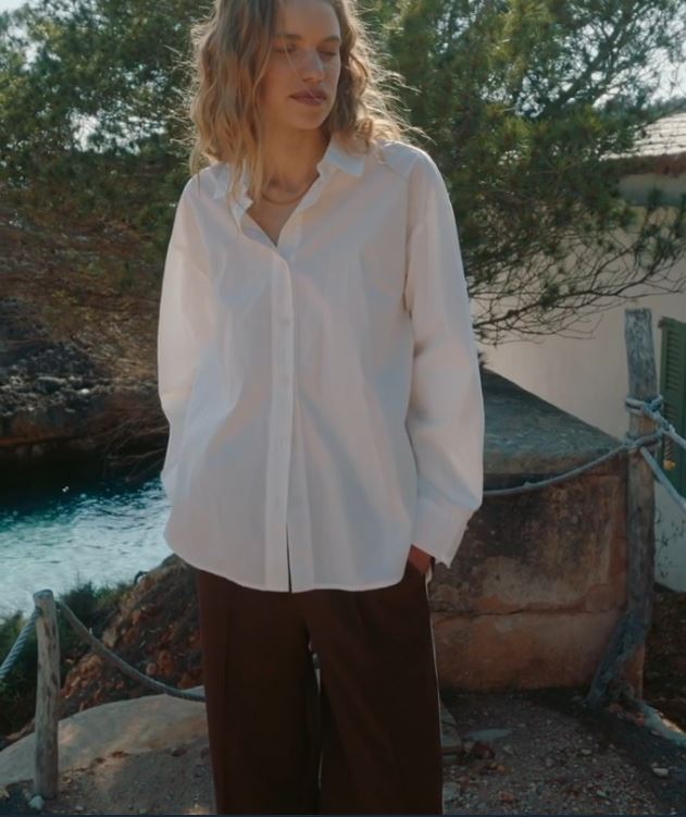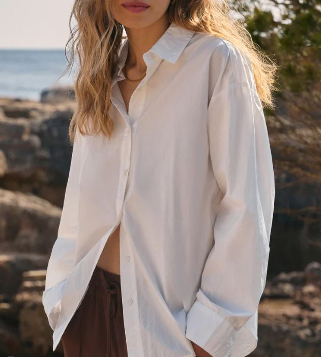 This poplin button-up brings structure to your wardrobe with a relaxed fit and lightweight, breathable cotton feel. The collared neckline and long sleeves make it ideal for dressing up or styling open over tanks