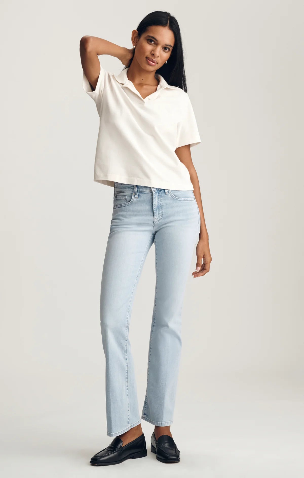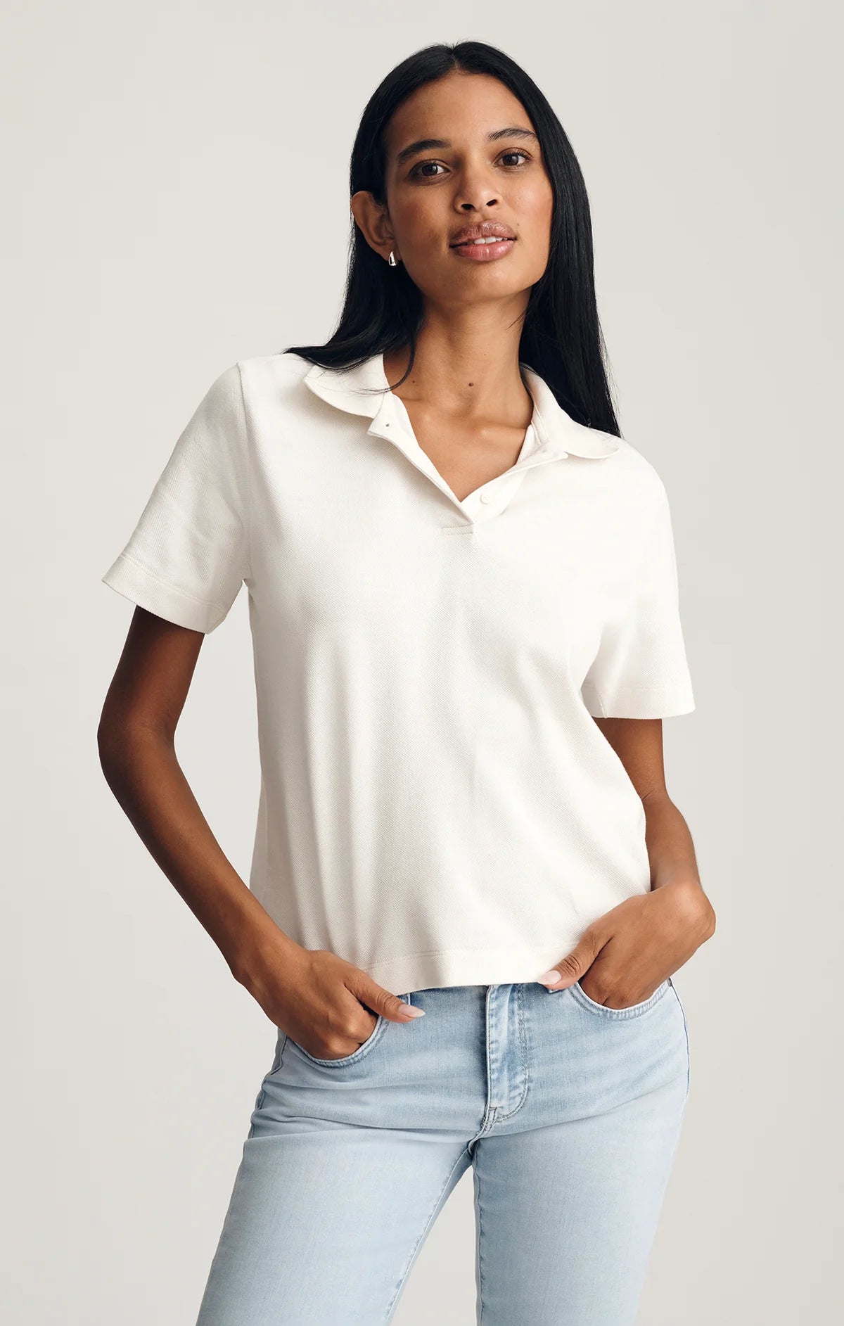 A boxy, cropped silhouette meets classic polo styling in this easy t-shirt. Finished with short sleeves, it pairs just as well with tailored trousers as with denim shorts. Coloring is more of an ivory, not as bright as the image portrays here