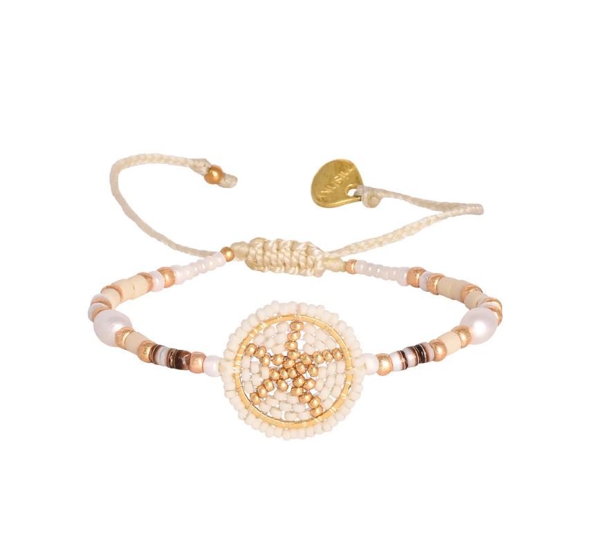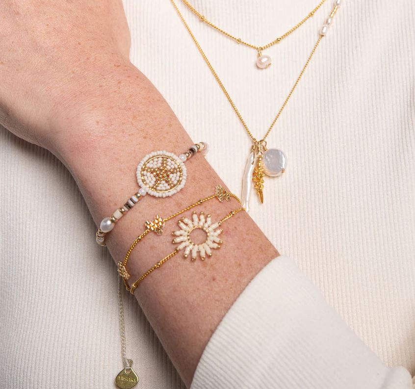 A delicate bracelet featuring Miyuki round beads in soft white tones, accented with rings and small gold-plated hoop. Its lightweight and airy design makes it perfect for everyday layering or adding a coastal touch to any look.