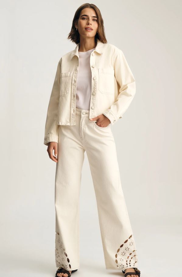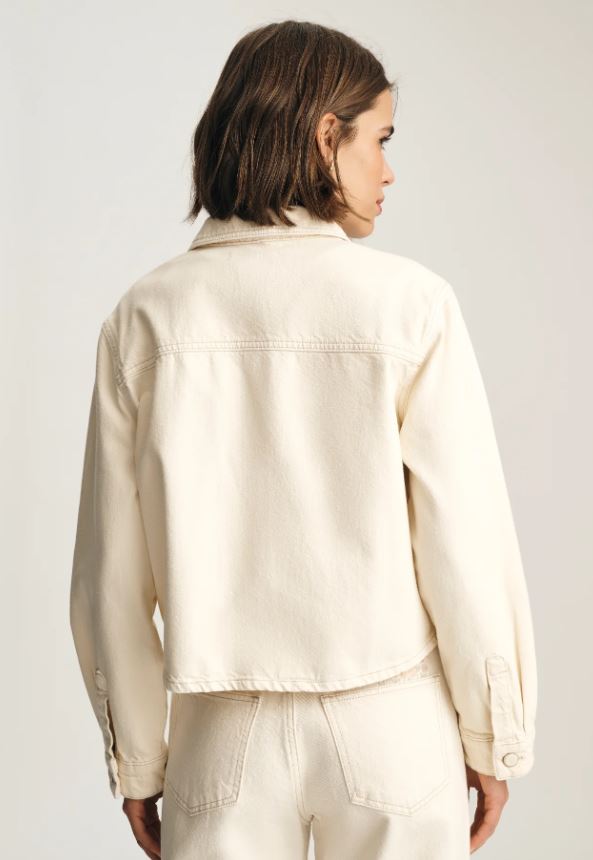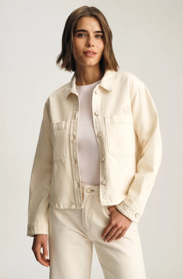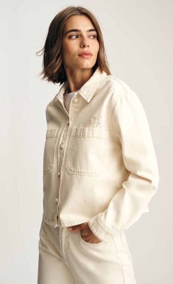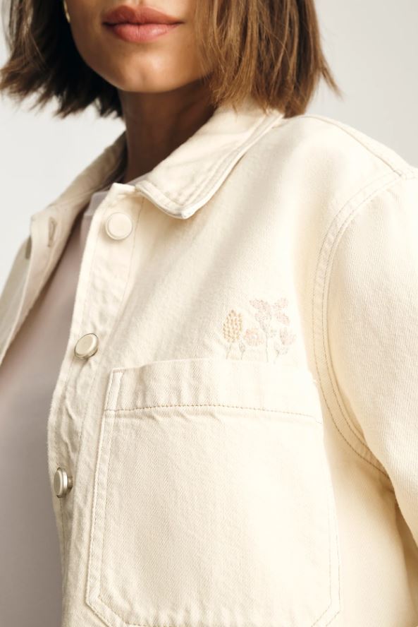 The effortless layer that makes the outfit. This is a cropped denim overshirt designed with a relaxed fit, patch pockets, and tonal buttons. This style is finished in cream with subtle floral embroidery on the chest. Pair with the Malibu for a matching set.