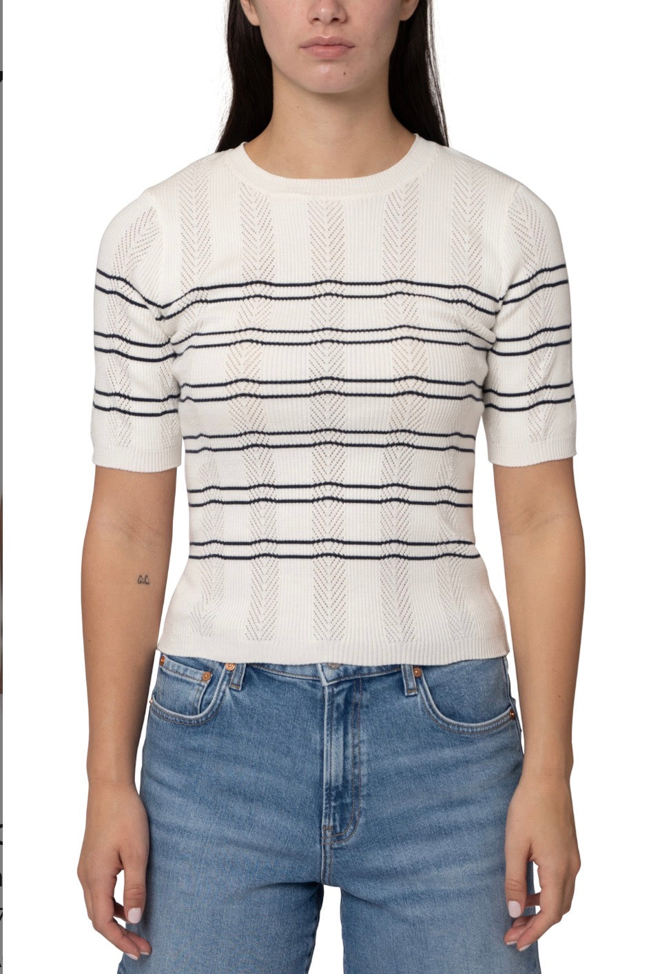 A beautiful weight, striped short sleeve. Taking a basic tee; and elevating it! Playful stripes, texture and a good fit!