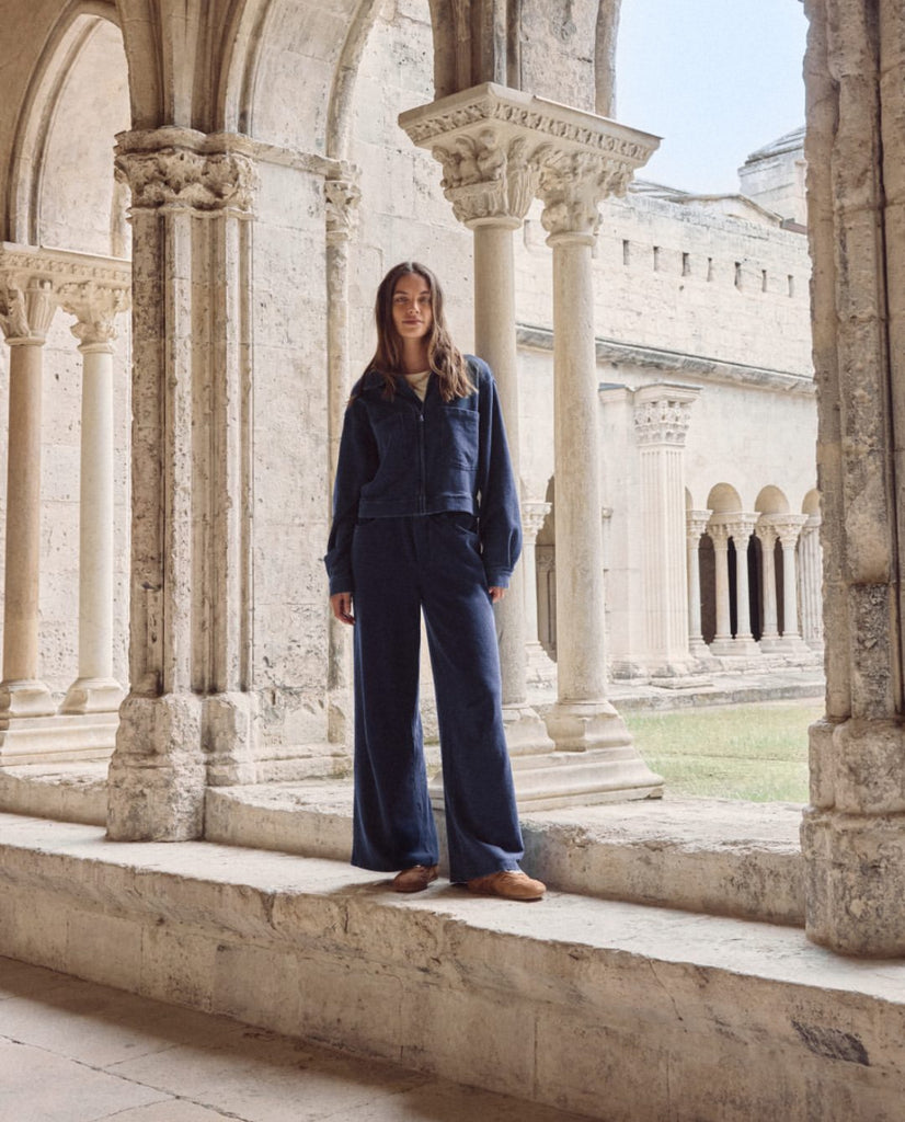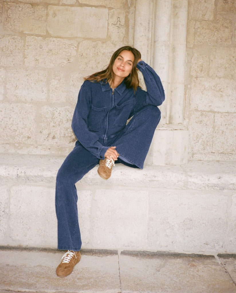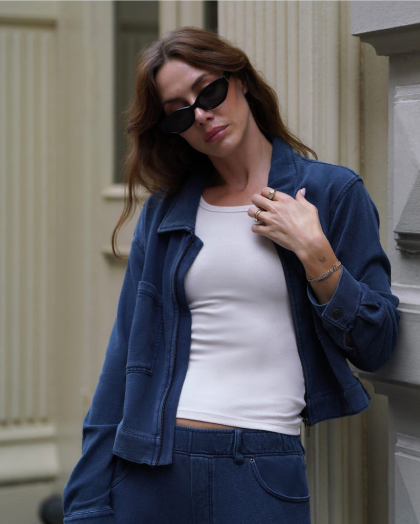 The vintage look of denim meets the softness of your favorite sweatshirt in this cropped jacket. Finished with roomy pockets and a zip front, it’s the kind of piece that works just as well with the matching pants as it does with a simple tee.