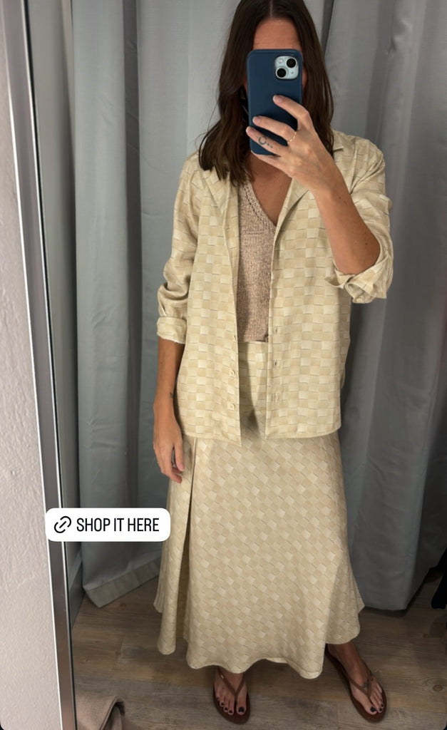 Placket collar button down. We love this paired back to denim or slacks but looks so effortlessly chic when rocked with the matching skirt! Whether you're pairing this fit to boots or a sneaker; you'll walk the streets in confidence!