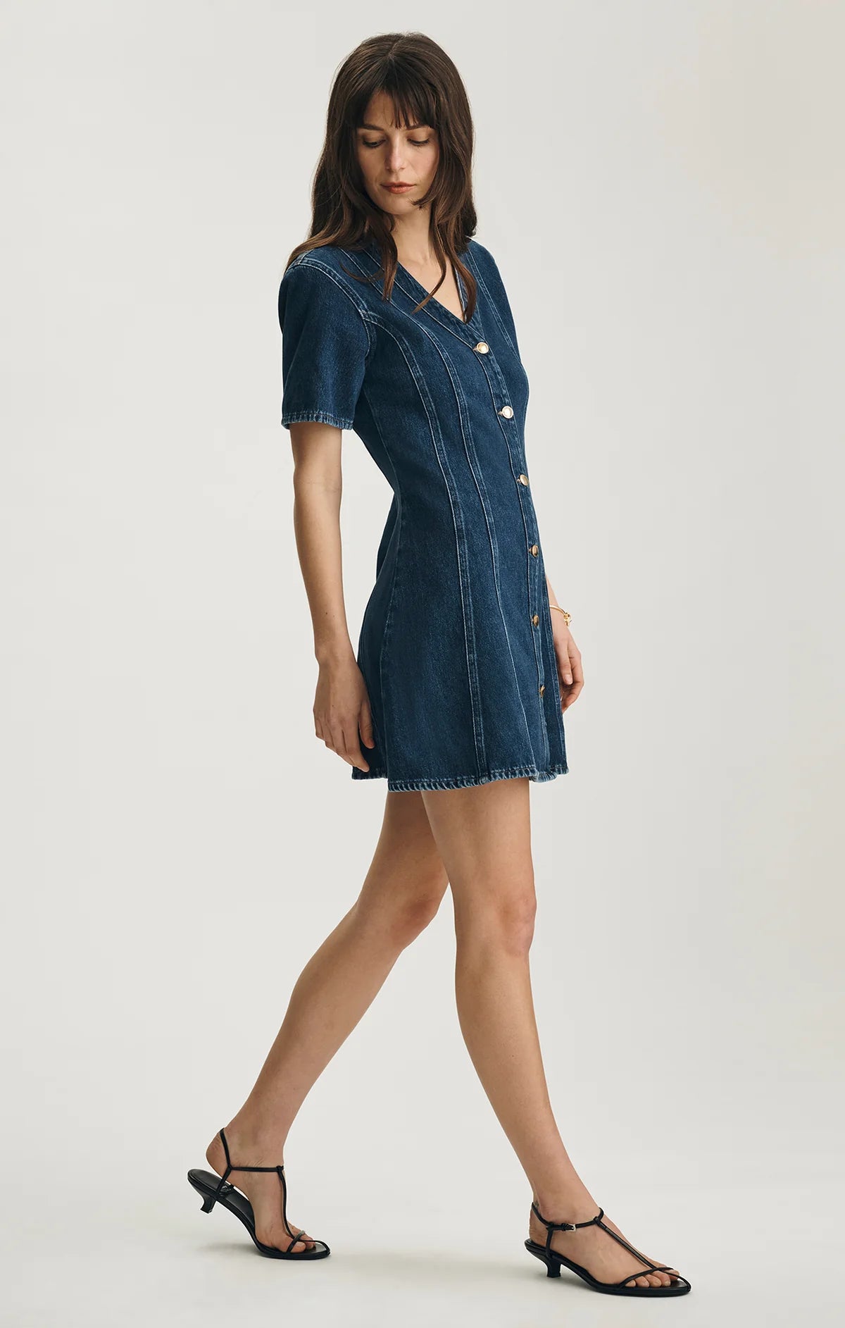 The Kristy Dress features a flattering fit-and-flare silhouette with a classic button-up front. Finished with a V-neck and short sleeves, this dress is perfect for warm-weather plans. This style comes in a true dark blue wash